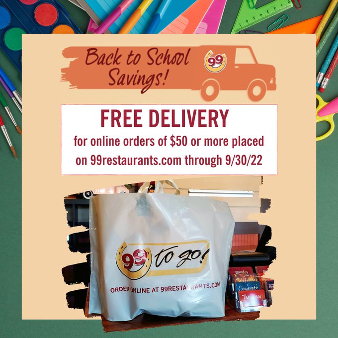 99 Restaurants US Coupon Codes - PromosGo 99 Restaurants sale - up to 20% Food & Beverage Get amazing coupons with 20% off when purchase what you want. Now is the best time to get it. soon, 2 USED, SUCCESS, 100%, Sales, deal, Online Ordering Now Available Wherever you want to buy, The 99 Restaurant is honored to provide you free delivery service for your order. Shop now with confidence,