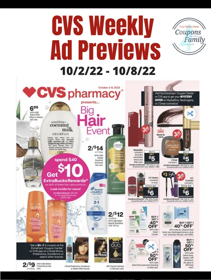 CVS Coupon Matchups - Weekly Ad Previews Here are the CVS Coupon Matchups for the week of 07/31-08/06. These are the best CVS Coupon Matchups for this week! $10.00 ExtraBucks Rewards wyb $40.00, Limit 1.