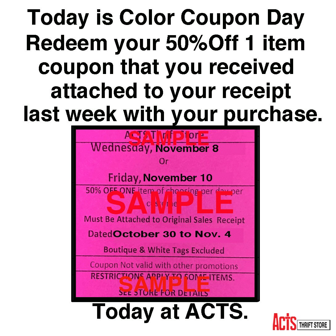 ACTS Thrift Store - Pasadena, CA - The ACTS Thrift Store experience is ... Wednesdays: Teachers, Students, Military and Pastors receive 20% off entire purchase with ID November 2 Thu 03 Thursday: 3pm to Close 40% OFF Entire Purchase November 3 Fri 04 Friday: 50% off one item with in-store coupon November 4 Sat 05 Giving and Helping Club eblast coupon November 5 Sun 06 Giving and Helping Club Text Blast Coupon November 6
